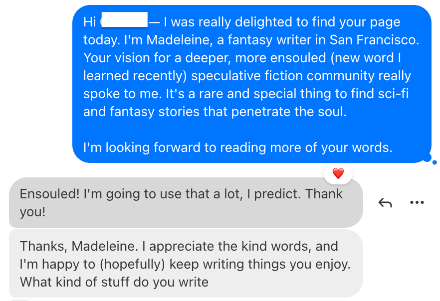 Try making a friend: It’s nice to meet people. Maybe DM someone to tell them you like their work. Maybe find someone locally who writes about a niche you love and grab coffee together IRL?